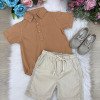 Esse conjunto é a escolha perfeita para os meninos que amam se vestir com estilo e conforto, ideal para aniversários, passeios, eventos e momentos especiais ao ar livre. Camisa:Confeccionada em tecido tipo linho 100% viscose, na cor marrom, possui modelagem moderna com mangas curtas, gola clássica, bolsinho frontal e botões em tom amadeirado, que trazem um toque artesanal e sofisticado. Bermuda:Acompanha bermuda bege de linho com cós elástico e cordão de ajuste 70% poliester, 16% viscose, 11% linho, 3% algodão, garantindo conforto e praticidade. O tecido leve e de toque suave proporciona liberdade de movimento, ideal para dias mais quentes. Destaques: Tecido leve e confortável tipo linho Modelagem moderna e elegante Cós com elástico e cordão regulável Ideal para eventos casuais ou festas ao ar livre Cores neutras e combináveis com diferentes calçados Sugestão de uso: Combine com mocassim ou sandálias infantis para um look completo e encantador! Perfeito para:Batizados, casamentos diurnos, ensaios fotográficos, festas de aniversário e momentos em família.